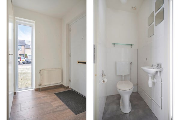 Entree/hal met meterkast en modern toilet met fonteintje.
