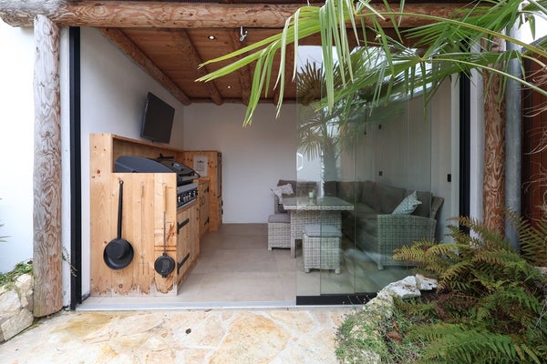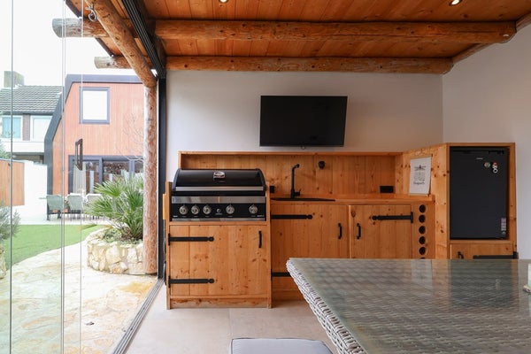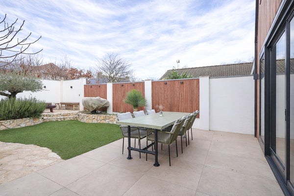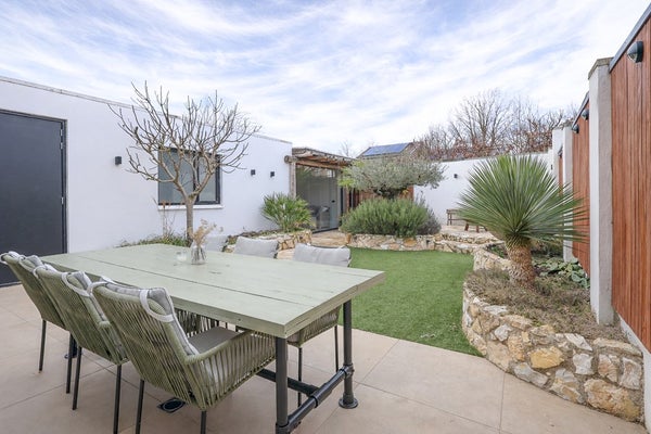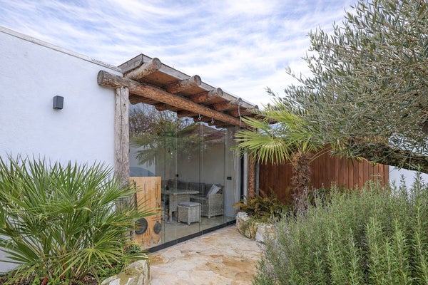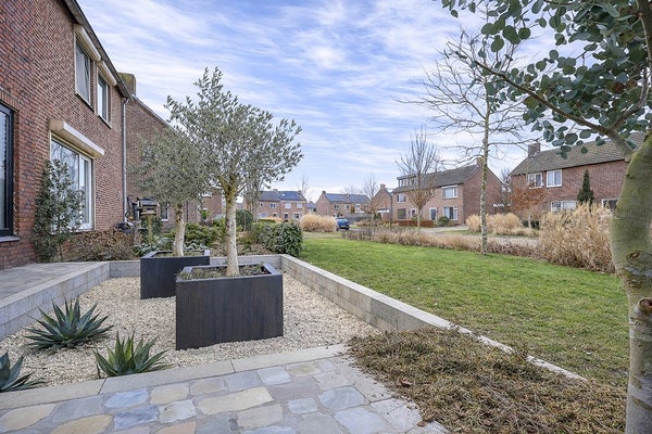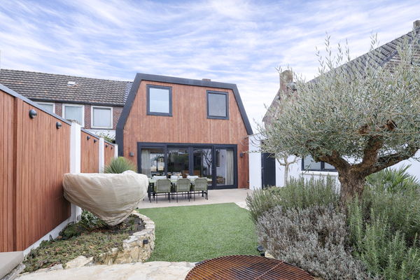 De achtertuin is fraai aangelegd met olijfbomen, lichte bestrating en meerdere zitplekken, waardoor je je hier in Spanje waant. Achter de berging een tuinkamer met glazen schuifwand, buitenkeuken en loungehoek.