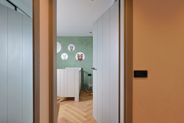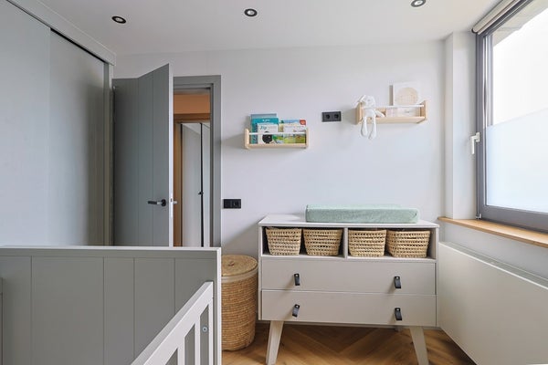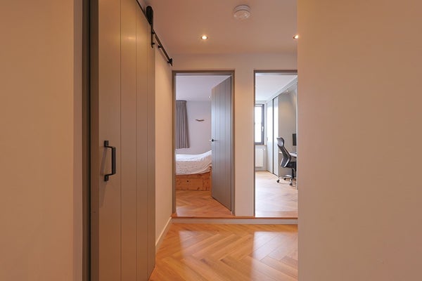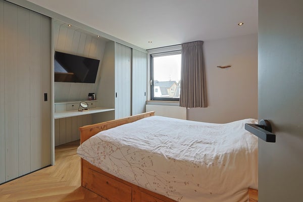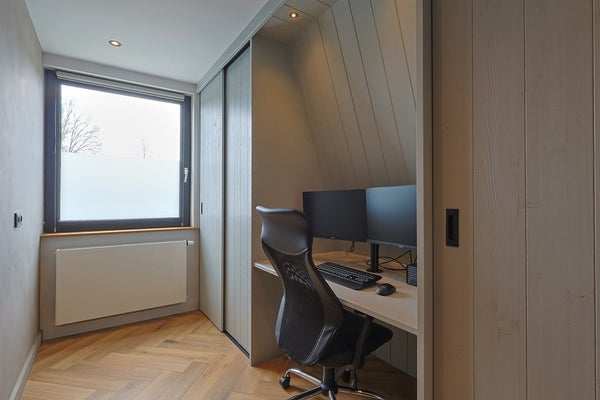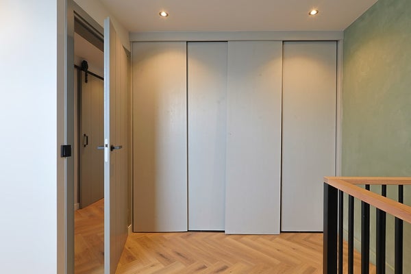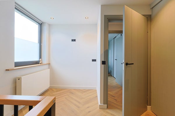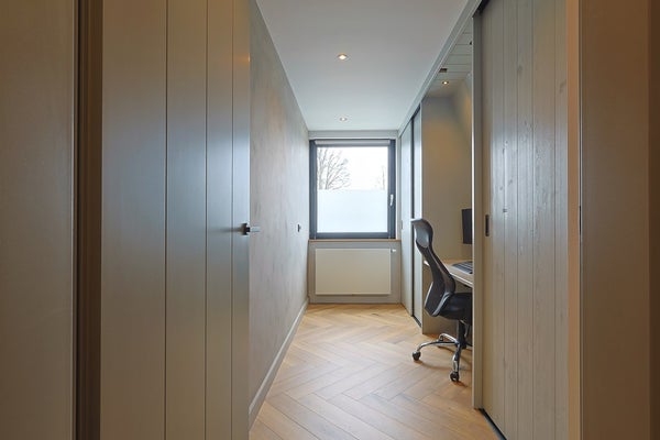 Overloop met toegang tot vier slaapkamers, waarvan één in gebruik als werk-/studeerkamer. Alle kamers zijn strak afgewerkt en voorzien van een laminaatvloer en vaste kasten.