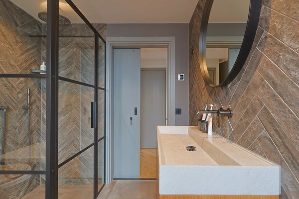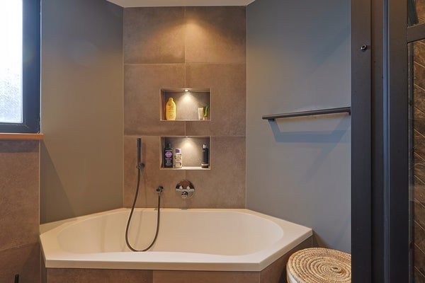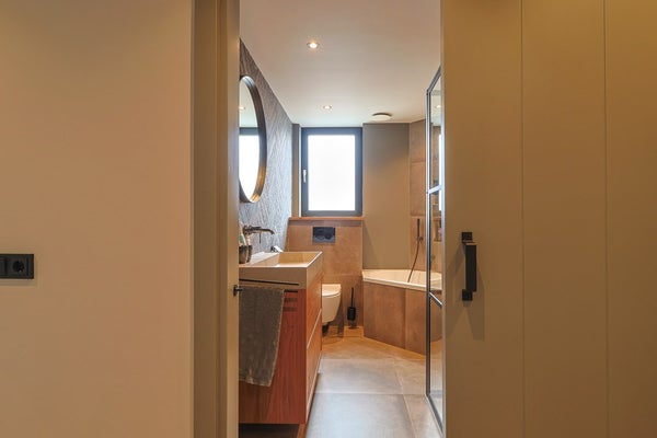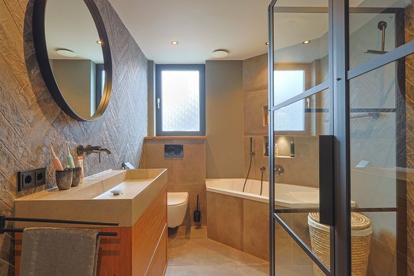 Moderne badkamer met ligbad, douchecabine, toilet, wastafelmeubel en elektrische vloerverwarming.