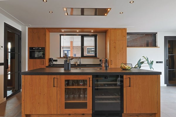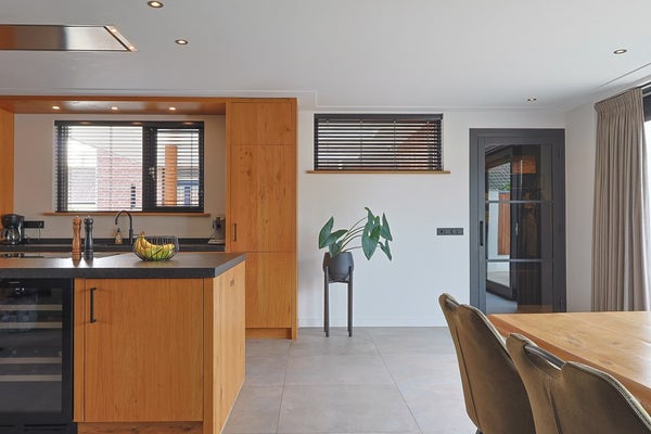 De luxe keuken met wandmeubel en kookeiland is voorzien van een inductiefornuis met heteluchtoven, grill en warmhoudlade, Quooker, koel-vriescombinatie, vaatwasser, magnetron en wijnklimaatkast.