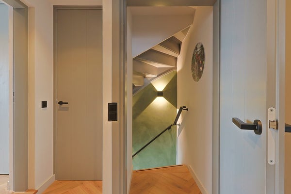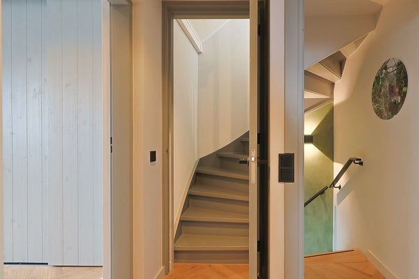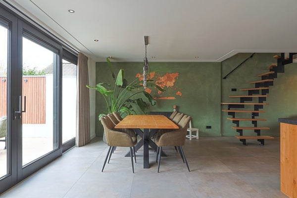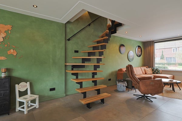 Aan de straatzijde een ruime zithoek, aan de tuinzijde de eethoek. In het midden van de woonkamer de open trap.