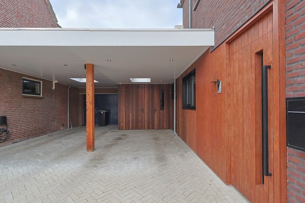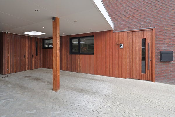 Oprit en een strakke carport met lichtkoepel en de twee deuren in aanbouw als dubbele achterom.