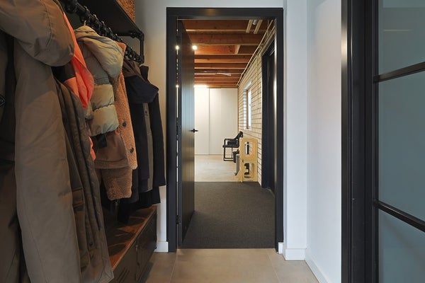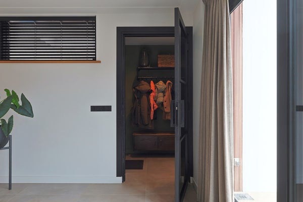 Via een glazen deur bereik je het portaal in de aanbouw als eerste achterom met garderobe en doorgang naar de ruime berging met kasten.
