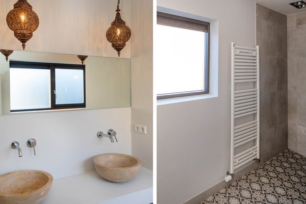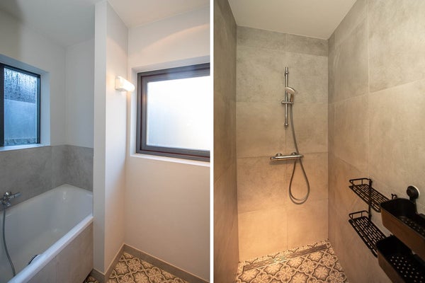 Hier treft u twee ruime slaapkamers, een praktische inloopkastenwand en een separate toiletruimte met wandcloset en fontein. De recent betegelde, royale badkamer is uitgevoerd in moderne stijl en voorzien van een inloopdouche, ligbad, dubbele wastafel met wastafelkommen en inbouwkranen, evenals een handdoekradiator — een comfortabele ruimte om volledig tot rust te komen.