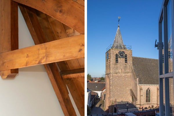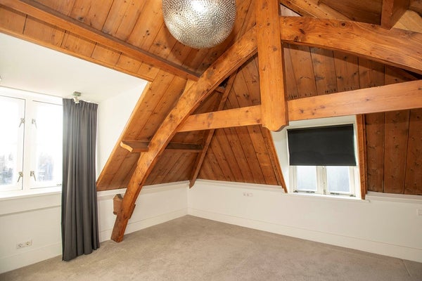 Via de vaste houten trap bereikt u de zolderverdieping met overloop en twee volwaardige slaapkamers. Beide slaapkamers zijn voorzien van een dakkapel en ramen, wat zorgt voor veel daglicht. De schuine daken met zichtbare houten balken geven deze verdieping een warme en karaktervolle uitstraling.