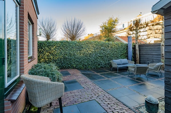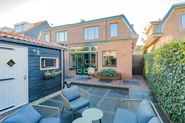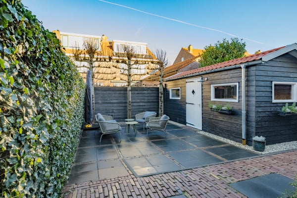 Via openslaande deuren bereik je de brede achtertuin op het oosten, waar je ’s ochtends van de zon geniet. De tuin beschikt over een poort naar de voorzijde en een grote houten schuur, geïsoleerd met een luchtspouw en daarmee ook geschikt voor opslag of hobbygebruik.