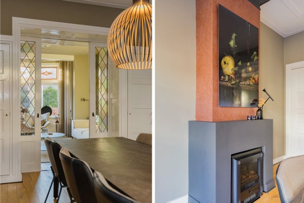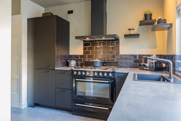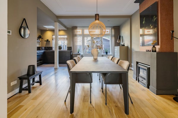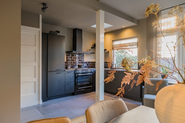 De woonkamer aan de voorzijde is knus en sfeervol, met een erker op het zuidwesten die zorgt voor veel lichtinval. Vaste kasten versterken het karakter en maken het een fijne plek om je terug te trekken. De en suite deuren met vaste kasten aan weerszijden verbinden de woonkamer met de ruime woon-/eetkamer aan de achterzijde. Hier bevindt zich ook de moderne open keuken, stijlvol uitgevoerd met een klassiek fornuis en oven. Wasmachine en droger zijn hier netjes geïntegreerd in vaste kasten bij de keuken. In de schouw zorgt een elektrische kachel voor extra sfeer. De houten vloer in de woon- en eetkamer sluit mooi aan op de donkergrijze tegelvloer in de keuken.