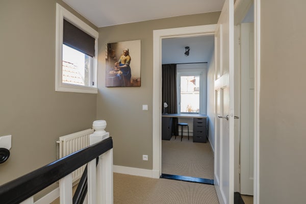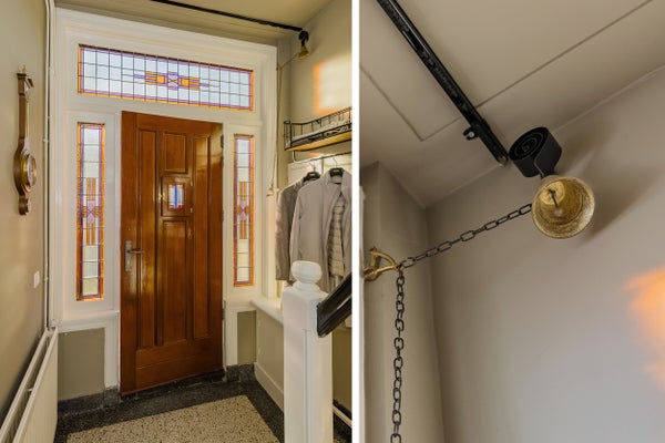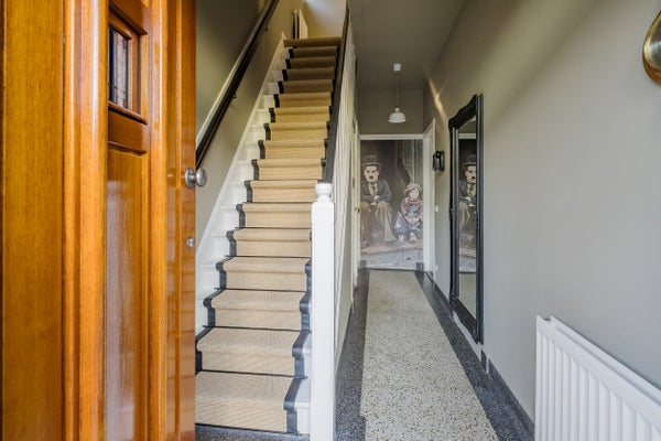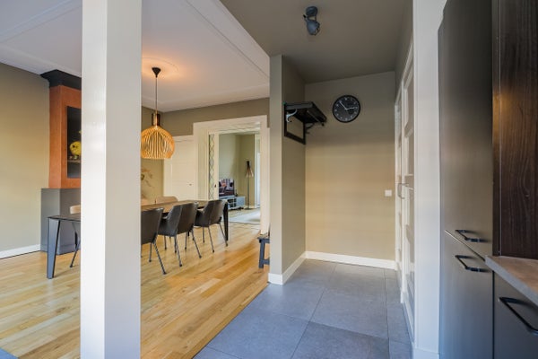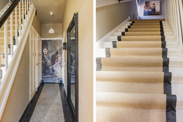Binnenkomst in de hal voelt direct goed. De originele granito vloer, de trap met loper en het prettige daglicht via het zijraam zetten de toon. In de gang bevinden zich een praktische trapkast en een gastentoilet.
