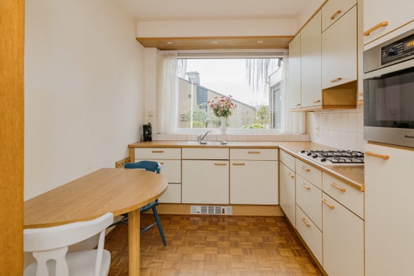 Op de begane grond vind je een lichte woonkamer met open haard, via de deur stap je zo de privacy biedende achtertuin in. De halfopen hoekkeuken sluit mooi aan op de woonkamer en biedt volop mogelijkheden om hier een eigentijdse woonkeuken te realiseren.