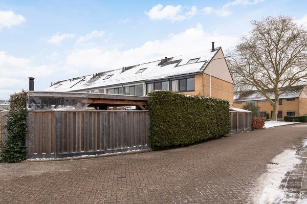 De nette voortuin van deze woning grenst direct aan een grasveldje waardoor er geen verkeer direct voor de voordeur is. Aan de zijkant bevindt zich een afdak voor het opstellen voor de containers. De achtertuin is bereikbaar langs de zijkant van het huis en via een eigen achterom.