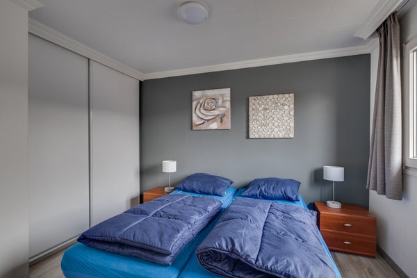 De indeling omvat een woonkamer met schuifpui naar het terras, een open keuken met inbouwapparatuur, een hoofdslaapkamer met vaste kasten, en een tweede slaapkamer geschikt voor twee eenpersoonsbedden. De badkamer is volledig betegeld en beschikt over een douche, wastafel en toilet. De woning is gemeubileerd en gestoffeerd en is gebouwd in 2009 met een woonoppervlak van 49 m². Permanente bewoning is niet toegestaan.