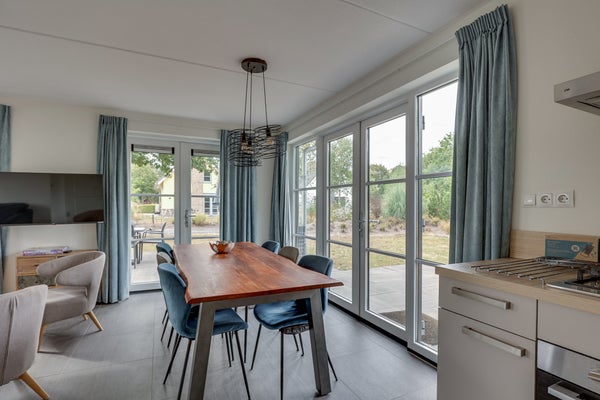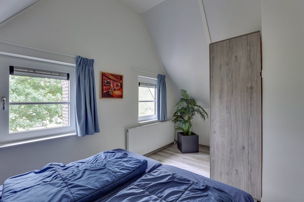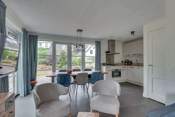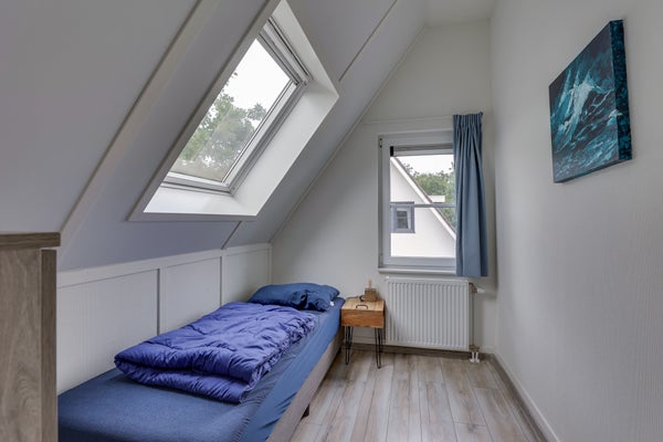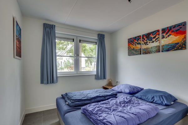 De begane grond bestaat uit een hal, een toilet, een slaapkamer met badkamer, en een moderne open keuken met inbouwapparatuur. De lichte woonkamer met vloerverwarming biedt toegang tot de tuin met een terras op het zuiden. Op de bovenverdieping bevinden zich twee eenpersoons slaapkamers, een tweede badkamer en een tweepersoons slaapkamer. Deze recreatiewoning is volledig geïsoleerd en beschikt over een energielabel B. Permanente bewoning is niet toegestaan.