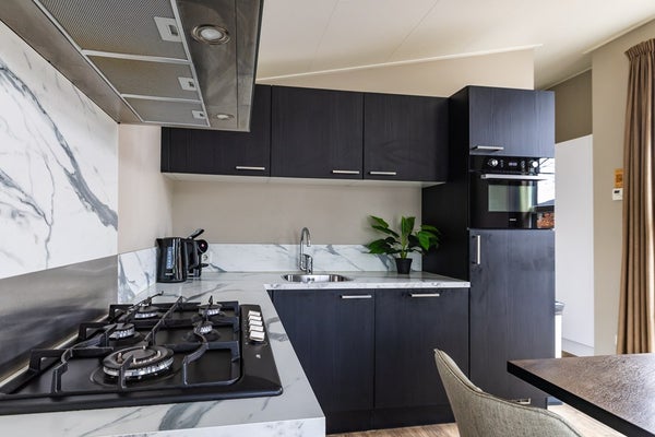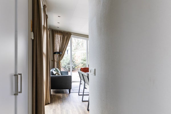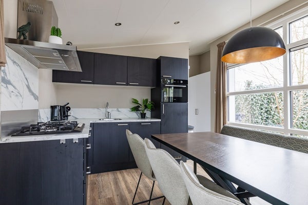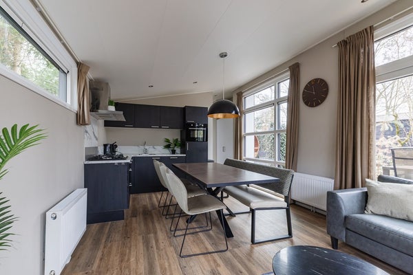 De woning is fraai vormgegeven, met een strak design en warme, natuurlijke uitstraling. Grote raampartijen zorgen voor veel daglicht en een mooi uitzicht op het groen rondom. In de woonkamer vindt u een gezellige zithoek, eettafel en airconditioning die zowel verwarmt als koelt. Ideaal in elk seizoen. De open keuken heeft een luxe uitstraling met zwarte kasten, een marmerlook achterwand en moderne inbouwapparatuur zoals een gaskookplaat, combimagnetron, vaatwasser en koelkast met vriesvak. De keuken is dan ook van alle gemakken voorzien.