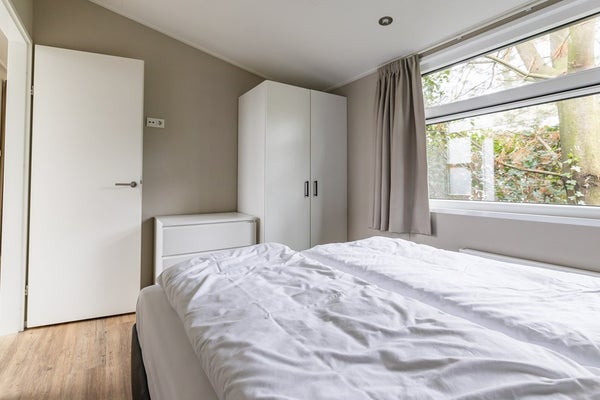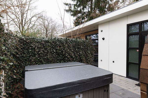 Een van de grootste pluspunten is de eigen wellness in de tuin: een royale houten sauna, buitendouche en een luxe jacuzzi op het betegelde terras. De tuin is omsloten met groen, wat zorgt voor maximale privacy en een ontspannen sfeer. U zit hier heerlijk beschut tussen de bomen, op een rustige plek in het park.