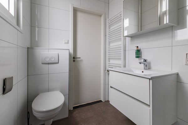 Er zijn twee ruime slaapkamers met comfortabele bedden, stijlvolle wandafwerking en praktische kastruimte. De badkamer is modern uitgevoerd met een royale inloopdouche, wastafelmeubel en toilet. Alles is fris, strak en keurig onderhouden.