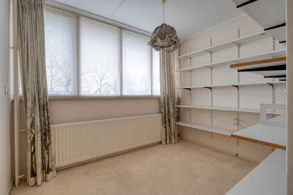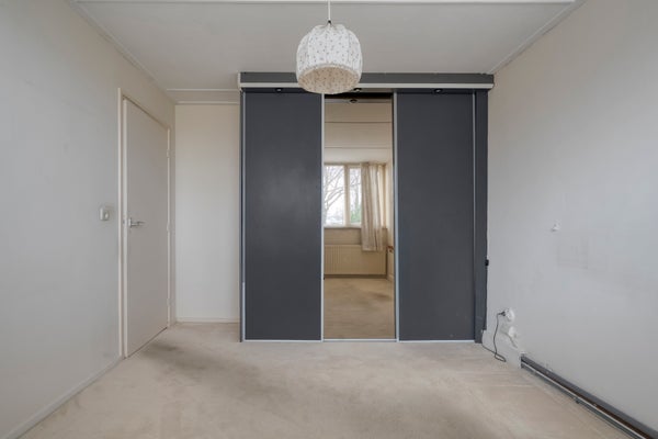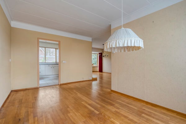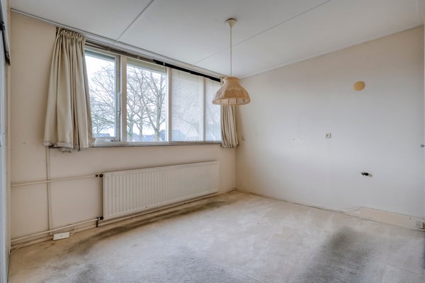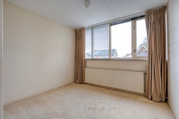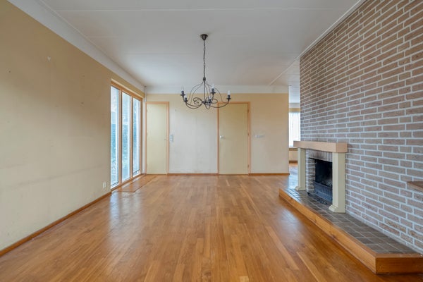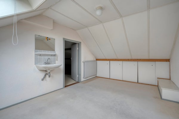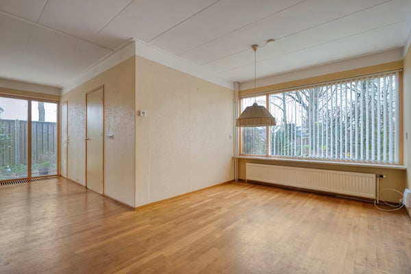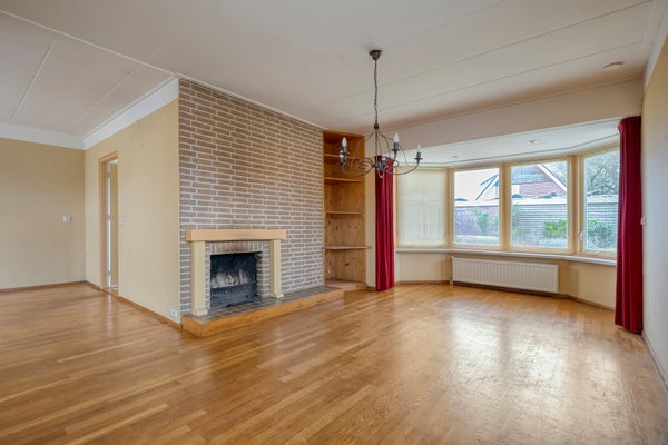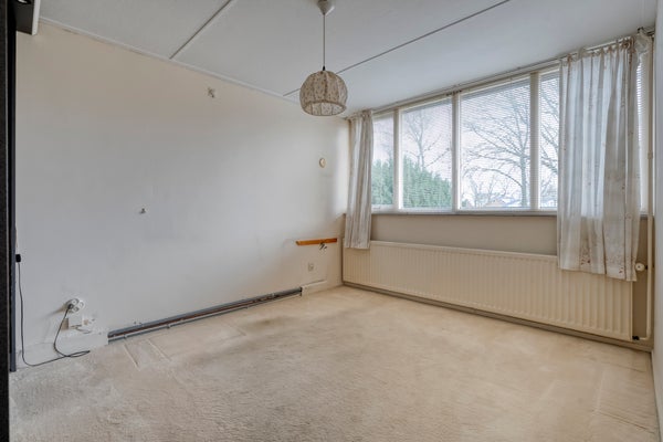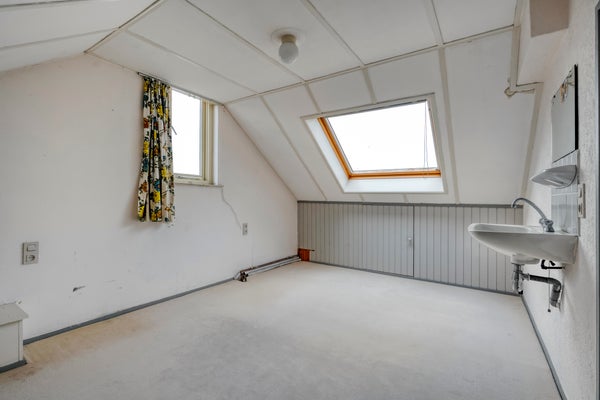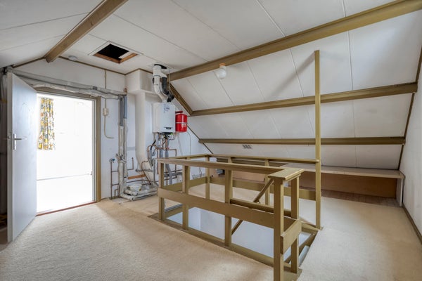 De begane grond heeft een lichte woonkamer met een parketvloer en een dichte keuken die enige aandacht kan gebruiken. Boven zijn er 4 slaapkamers en een badkamer met inloopdouche, wastafel en tweede toilet. Een royale vijfde slaapkamer op de tweede verdieping heeft een groot dakvenster.