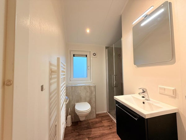 De badkamer is modern en verzorgd, met een prettige indeling die dagelijks gemak combineert met een frisse uitstraling. Met douche, wastafelmeubel en toilet heeft u hier alles wat u nodig heeft om de dag comfortabel te starten en na een actieve dag buiten weer heerlijk op te frissen.