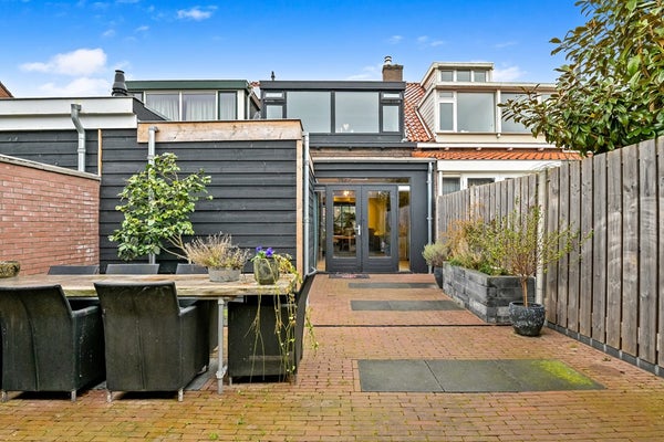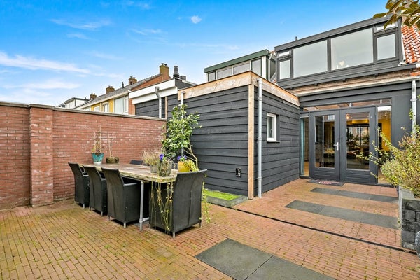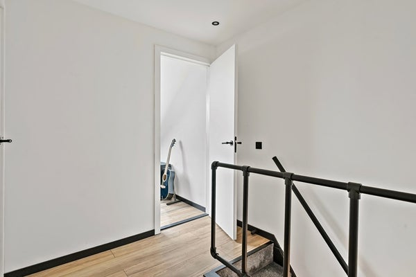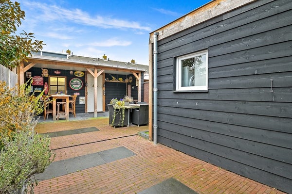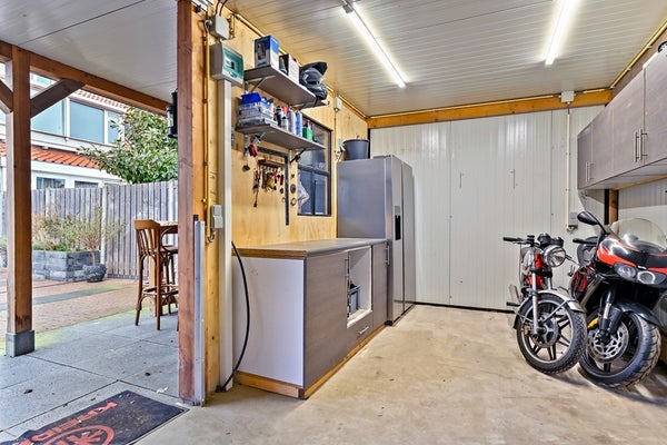 Je komt binnen via de hal met meterkast en trapopgang. Vanuit hier loop je door naar de woonkamer: een prettige, lichte leefruimte met een goede indelingsmaat voor zowel een zit- als eethoek. Aansluitend ligt de woonkeuken — het hart van het huis — met directe verbinding naar de tuin. Dankzij deze opzet is het een fijne plek om te koken, te eten en samen te komen. De luxe keuken is voorzien van diverse inbouwapparatuur. Op de begane grond bevinden zich bovendien een extra badkamer en een separaat toilet, praktisch bereikbaar via de gang aan de achterzijde. Hier zijn ook de aansluitingen voor wasmachine en droger te vinden. Buiten verrast de woning direct. Aan de achterzijde van de woning ligt een verzorgde achtertuin met overkapping, waar je het hele jaar door beschut buiten kunt zitten. Daarnaast beschikt de tuin over een royale schuur en een praktisch achterom, perfect voor fietsen, opslag of klussen. Ook de voortuin zorgt voor extra afstand tot de straat en een prettige entree.