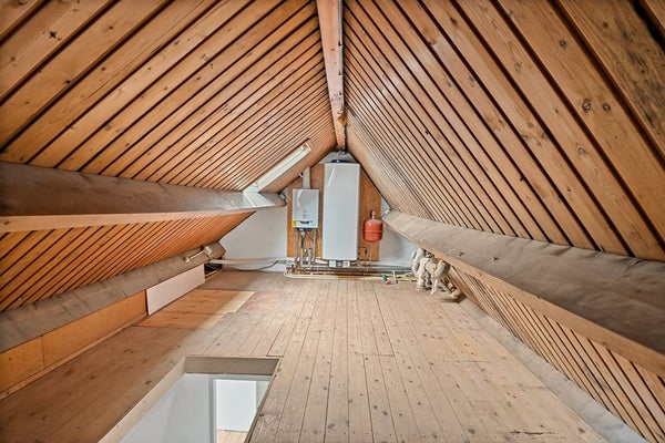 Riante bergzolder met vaste trap. Op de bergzolder is de CV-combiketel met de warmwaterboiler opgesteld.