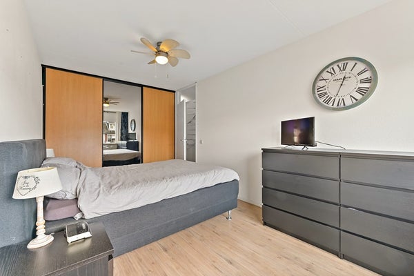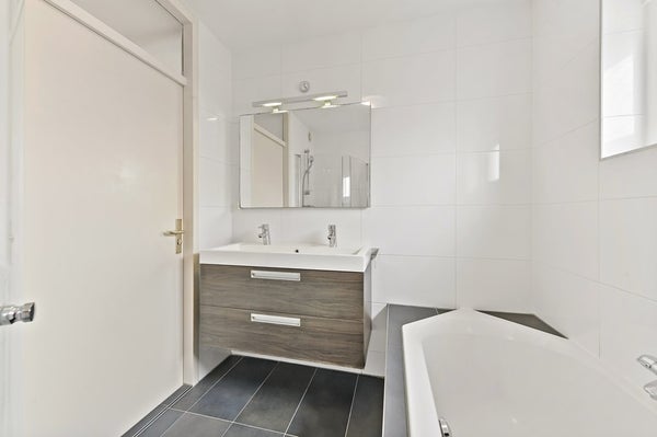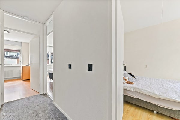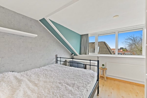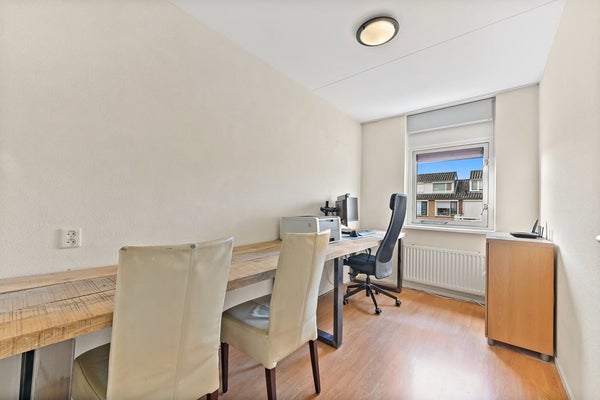 Vanaf de overloop heeft u toegang tot de drie slaapkamers, het separate toilet en de badkamer. Aan de achterzijde van de woning bevinden zich twee slaapkamers. De hoofdslaapkamer is ruim van opzet en beschikt over een vaste kastenwand wat zorgt voor praktische opbergruimte. De tweede kamer is eveneens ruim van formaat en wordt op dit moment gebruikt als kantoor. De derde slaapkamer is aan de voorzijde van de woning te vinden. Deze kamer is ruim van formaat en praktisch ingedeeld. Direct daarnaast ligt de nette, volledig betegelde badkamer. Deze is uitgerust met een wastafelmeubel, ligbad en douchecabine. Dankzij het raam in de voorgevel is er prettig daglicht en natuurlijke ventilatie aanwezig.