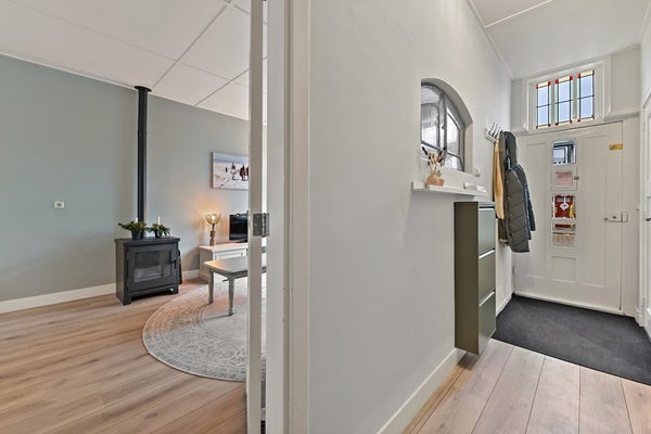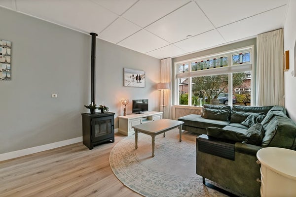 • Ruime woonkamer (ca. 27 m²) voorzien van een pelletkachel, (schuim)betonvloer met openslaande deuren naar de tuin en grote raampartij met zicht op voortuin en straat, voorraam met karakteristiek glas-in-lood.