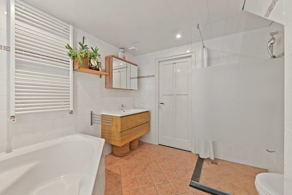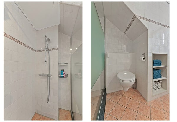 • Ruime badkamer aan de achterzijde met tegelwerk, hoekbad, inloopdouche, vaste wastafel met meubel, 2e toilet en design radiator.