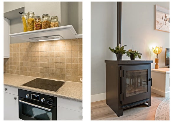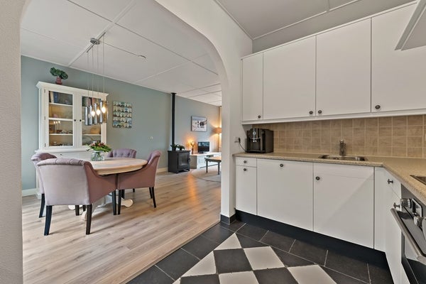 • Open keuken (ca. 6 m²) met leuke tegelvloer, moderne L-vormige opstelling met 4 pits keramische kookplaat met wasemkap, oven, spoelbak met mengkraan, vaatwasser en koel-vrieskast.