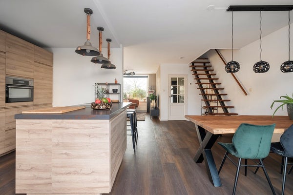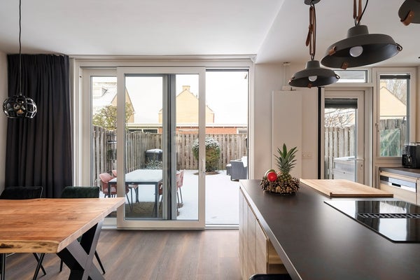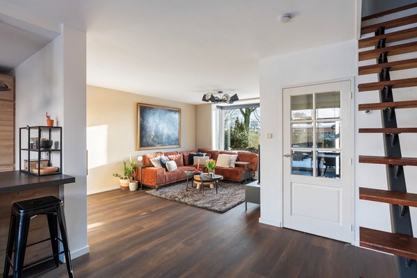 Zodra je je jas hebt opgehangen en de hal achter je laat, ontvouwt zich een woonkamer die indruk maakt door zijn ruimtelijkheid én afwerking. De grote raampartijen aan de achterzijde en de erker aan de voorzijde halen het daglicht royaal binnen – iets wat meteen een gevoel van thuiskomen oproept. In 2024 zijn alle ramen, kozijnen, schuifpui en deuren volledig vervangen met triple HR+++ glas, wat naast een lage energierekening ook zorgt voor een geluidsarme omgeving.