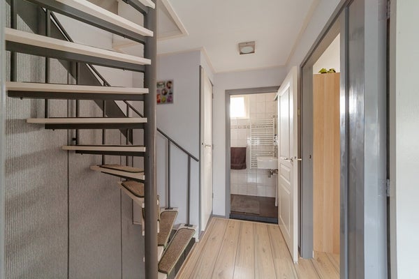 Overloop, 3 slaapkamers, kast met aansluiting wasmachine, geheel betegelde badkamer met douchecabine en wastafelmeubel. De verdieping heeft laminaatvloeren.