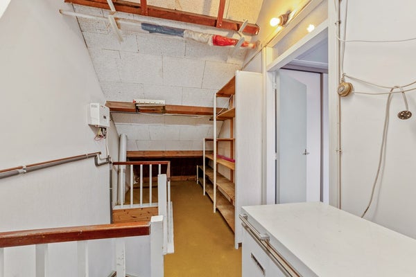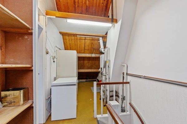 Grote voorzolder met veel bergruimte aan weerszijden. Opstelplaats voor de Cv-ketel (Vaillant Eco Plus uit 2023).