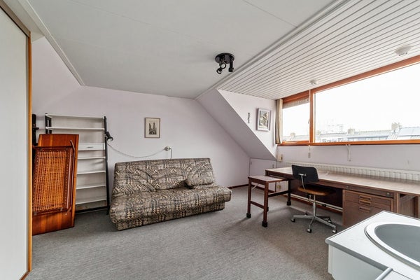 Zeer ruime 4e slaapkamer met dakkapel en wastafel. Via een deur toegang tot heel veel extra bergruimte!