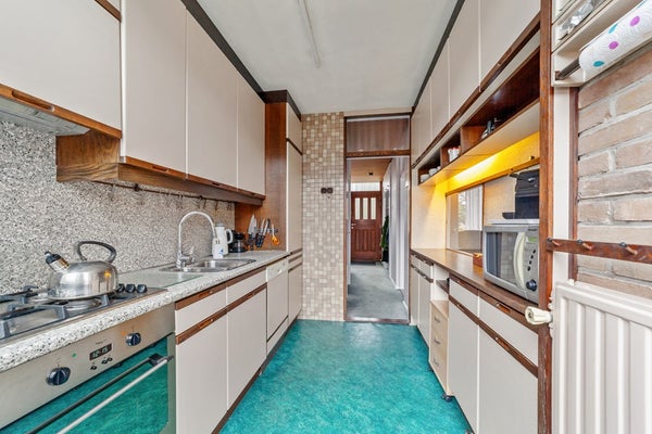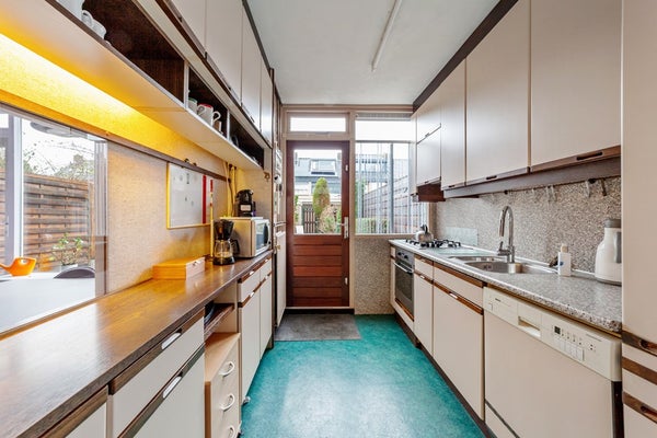 Keuken voorzien van diverse apparatuur met deur naar de grote achtertuin op het noord/westen.