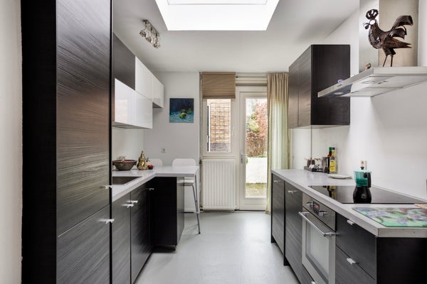 De keuken, die aan de achterkant van de woning is gesitueerd, is van alle gemakken voorzien met apparatuur en lichtkoepel. De begane grond is stijlvol afgewerkt met een houtenparket vloer, wat zorgt voor een sfeervolle uitstraling. Badkamer indeling: badkamer met een ruim bad (douch-combi) en vaste brede wastafel en meubel en toilet.