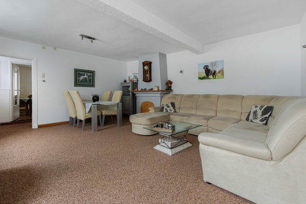 We betreden de woning via de entree, die toegang biedt tot de keuken, woonkamer en de kelder. De entree en de woonkamer zijn voorzien van een grindvloer. De woonkamer is prettig licht en heeft een oppervlakte van circa 27 m².