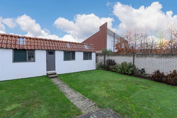 Aansluitend aan de keuken bevindt zich de bijkeuken/tuinkamer van ruim 10 m², eveneens voorzien van een tegelvloer en een tweede keukenblok. Hier bevinden zich de opstelplaatsen voor de wasmachine, vaatwasser en de CV-ketel. Vanuit deze ruimte is tevens de badkamer bereikbaar, ingericht met een wastafelmeubel, ligbad en toilet. Tevens is hier een extra wasmachineaansluiting aanwezig.