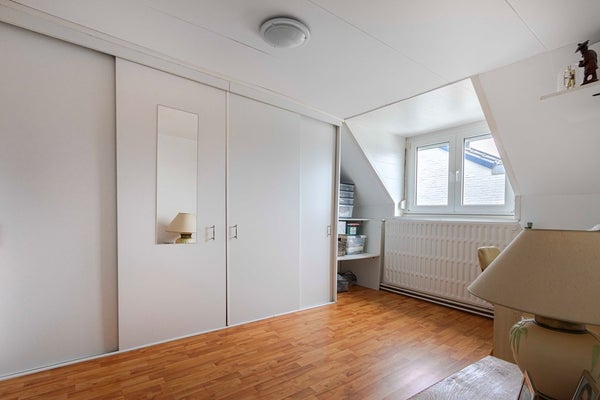Via de trapopgang bereiken we de overloop op de eerste verdieping. Vanaf hier zijn drie slaapkamers toegankelijk. De eerste slaapkamer heeft een oppervlakte van circa 9 m² en bevindt zich aan de voorzijde van de woning. De tweede slaapkamer heeft zicht op de achtertuin en is ca. 13 m²; beide zijn voorzien van praktische inbouwkasten. De derde slaapkamer heeft een oppervlakte van circa 10 m² en ligt aan de zijkant van de woning.