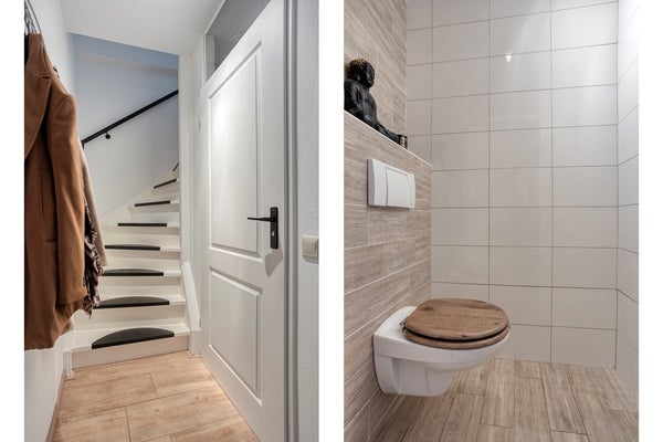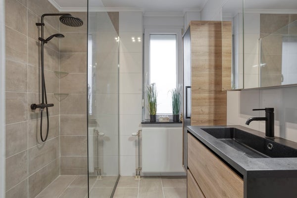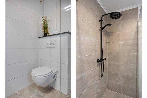 Via vaste trap te bereiken overloop met toegang tot 3 slaapkamers, de technische ruimte en de badkamer. Slaapkamer 1 en 2 (ca. 11 en 6m²) bevinden zich aan de achterzijde van de woning. Slaapkamer 3 (ca. 12m²) bevindt zich aan de voorzijde. De slaapkamers hebben allen keurige laminaatvloeren, kunststof kozijnen met isolerende HR- beglazing en rolluiken. In de technische ruimte bevinden zich de opstelling van de Cv-ketel (Nefit, HR combi, eigendom & bouwjaar 2023), de unit voor de mechanische ventilatie en de aansluitpunten voor de wasmachine. De moderne badkamer (ca. 4m²) is geheel betegeld en uitgerust met een royale (inloop)douche met regen- en handdouche, een designradiator, een vaste wastafel in ombouwmeubel en een wandcloset. Het geheel is keurig afgewerkt en voorzien van mechanische ventilatie.