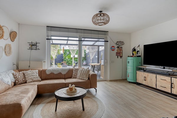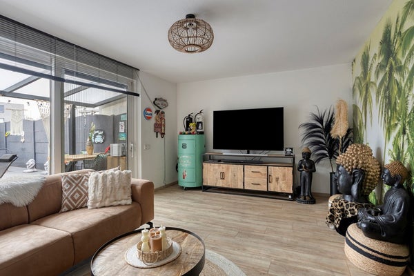 Entree/inkomhal (ca. 2m²) met meterkast (automatische groepen en slimme meters) en toegang tot de living. Sfeervolle L- living (ca. 26m²), voorzien van een keurige laminaatvloer. De zitkamer is aan de achterzijde gelegen en middels een schuifpui met horraam is er toegang tot de achtertuin. Het eetgedeelte bevindt zich aan de andere zijde en geeft toegang tot de semi-open keuken (ca. 7m²), gelegen aan de voorzijde van de woning. De keuken is voorzien van een luxe keukeninstallatie in hoekopstelling met boven- en onderkasten, lades en de volgende (inbouw)apparatuur, te weten: spoelbak, vaatwasser, 4-pits inductie kookplaat, design afzuiginstallatie, oven en een losse koel-vriescombinatie. Het geheel is netjes afgewerkt met een kunststof werkblad. Tussenhal met toilet en trapopgang naar de verdieping. Het toilet (ca. 1m²) is deels betegeld en voorzien van een wandcloset.