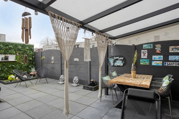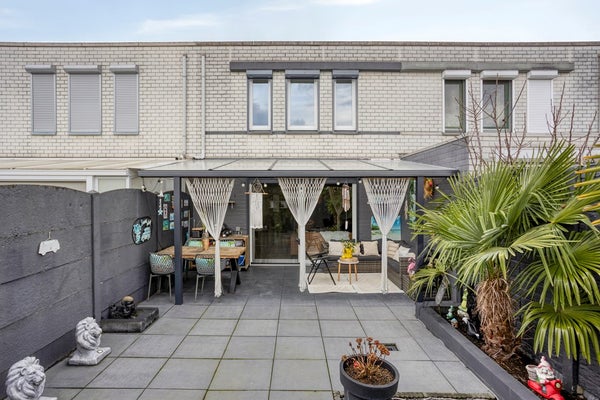 De onderhoudsvriendelijke achtertuin (ca. 50m²) is gesitueerd op het zuidoosten. De tuin is grotendeels betegeld en beschikt verder over een border met diverse (volwassen) beplantingen, een buitenberging (ca. 7m²) en een achteringang. Tevens is er een fijne terrasoverkapping gerealiseerd, met ingebouwde verlichting, alwaar men fijn kan genieten van warme zomeravonden.