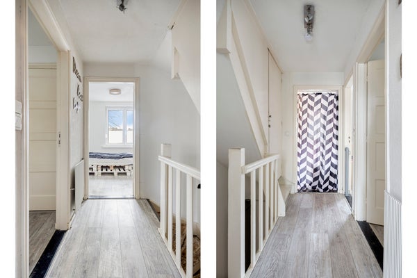 Via de overloop op de eerste verdieping bereik je drie slaapkamers, de badkamer én de vaste trap naar de zolder.