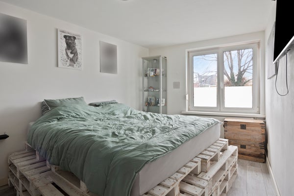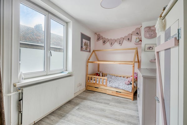 Aan de voorzijde van de woning bevindt zich een slaapkamer met een grote raampartij en uitzicht op de rustige straat — een fijne plek om tot rust te komen. De royale master bedroom aan de achterzijde biedt volop ruimte en is uitgerust met rolluiken. De derde slaapkamer, eveneens aan de achterzijde, is de kleinste kamer en beschikt ook over een rolluik. Vanuit zowel de master bedroom als deze slaapkamer kijk je uit over de tuin.