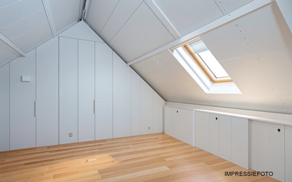 Aan de achterzijde zijn twee grote dakramen geplaatst, waardoor deze verdieping heerlijk licht is. Hier heb je de beschikking over een grote (slaap)kamer, met laminaat op de vloer en bergruimte in de schuinten van het dak. In een berging hangt de HR-ketel (Nefit, circa 2004, eigendom), waarbij er ook nog genoeg ruimte over is voor de koffers en andere spullen.