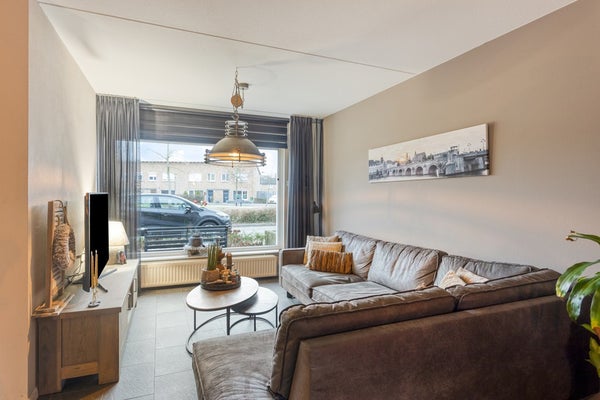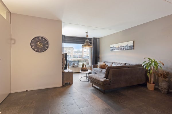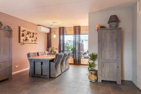De doorzonwoonkamer heeft een mooie lichtinval door de grote raampartij die voorzien is van rolluik aan zowel de voorzijde als aan de achterzijde. De woonkamer en keuken is voorzien van een plavuizen vloer. Onder de trap bevindt zich een trapkast, een ideale extra bergruimte. Tevens hangt er in de woonkamer een airconditioning die zowel kan koelen als verwarmen.