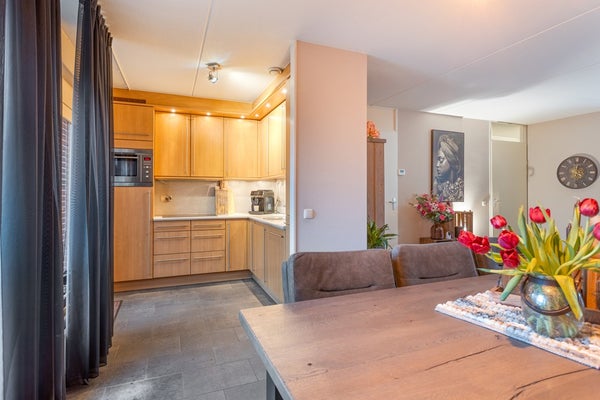De keuken in hoekopstelling is voorzien van een inductiekookplaat, afzuigkap, hetelucht-oven, vaatwasser en koelkast. Er is meer dan voldoende opbergruimte.
