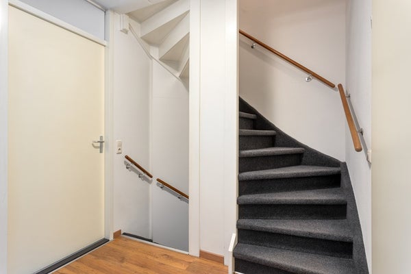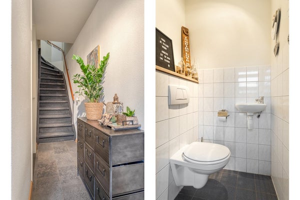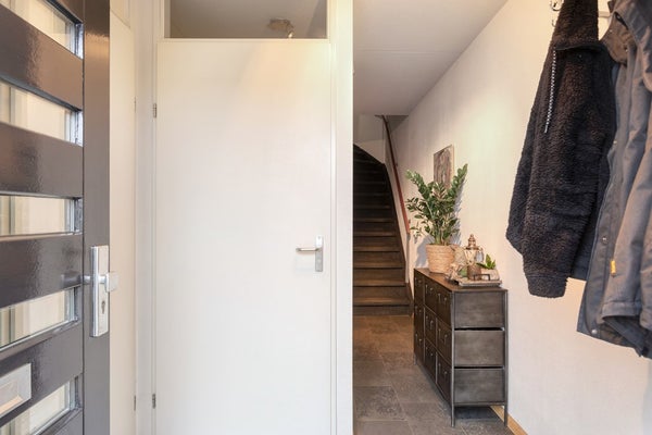 Entree met vernieuwde meterkast, opgaande trap, toiletruimte met closet en fonteintje en toegang tot de woonkamer.