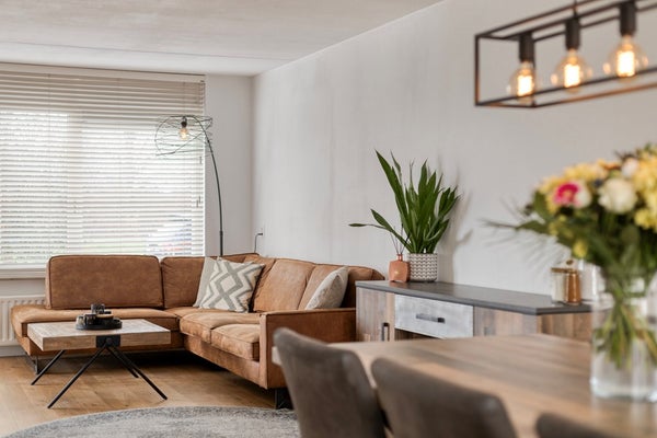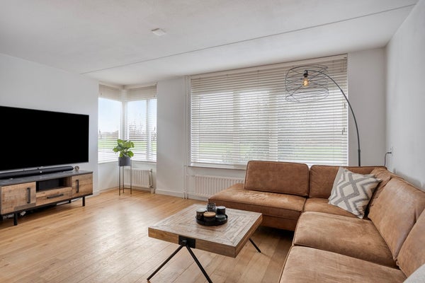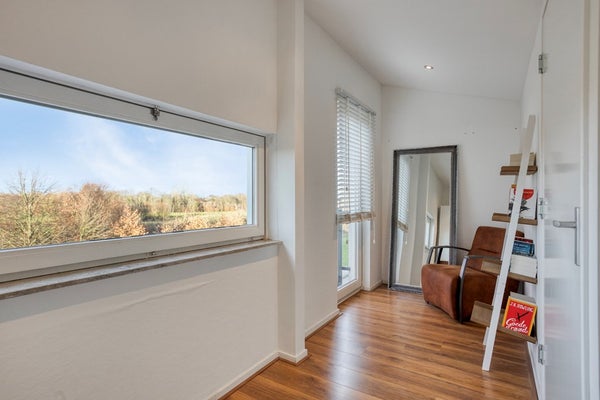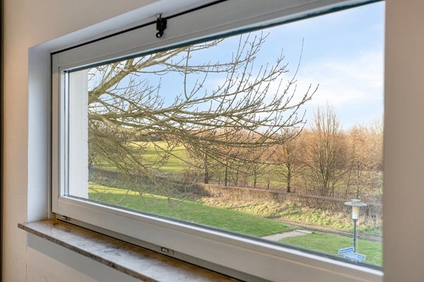 Via de ontvangsthal met modern betegeld toilet (hangcloset en fonteintje) bereik je de ruime en sfeervolle woonkamer. Dankzij de grote raampartijen geniet je hier van een prettige lichtinval en een prachtig vrij uitzicht. De eikenhouten vloer geeft de ruimte een warme, tijdloze uitstraling.