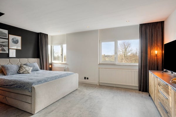 Slaapkamer 1ligt aan de voorzijde en biedt een schitterend vrij uitzicht over de internationale golfbaan. De inbouwspots zorgen voor een moderne afwerking.