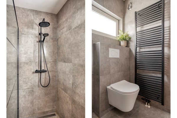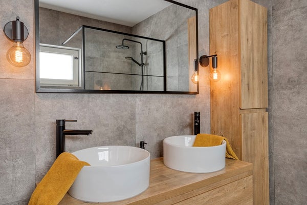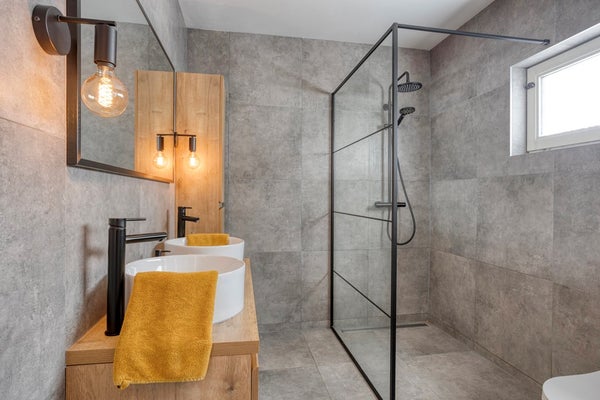 De moderne badkamer is compleet uitgerust met een dubbele wastafel, inloopdouche en toilet.