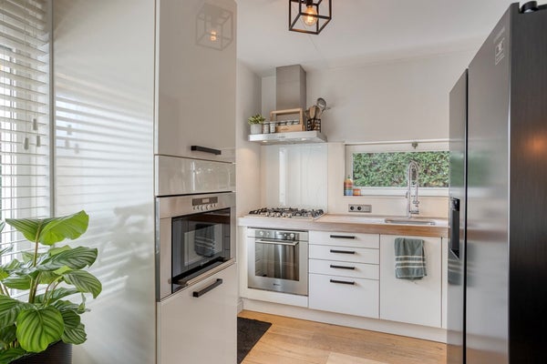 De open keuken sluit naadloos aan op de woonkamer en is uitgerust met diverse inbouwapparatuur, waaronder een oven, magnetron, afzuigkap, gasfornuis met wokbrander en vaatwasser. De royale Amerikaanse koelkast met geïntegreerde ijsmachine maakt het geheel compleet.